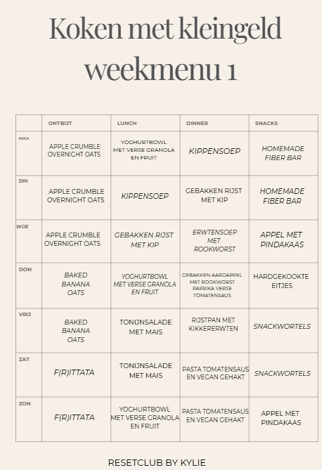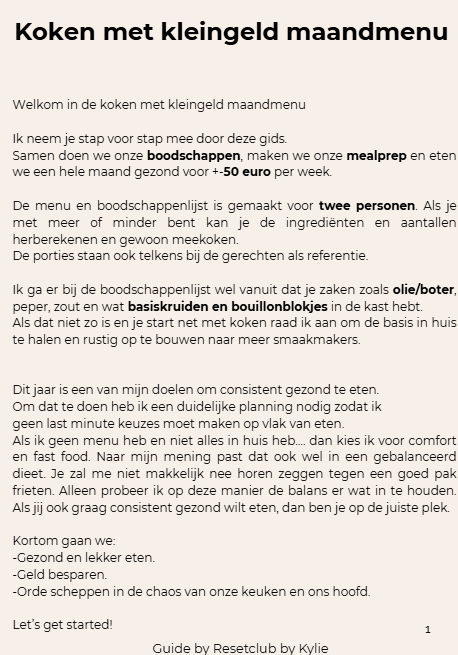 Een volledige maand aan maaltijden uitgewerkt. Inclusief boodschappenlijst, recepten en instructies. Budget: €50 per week.